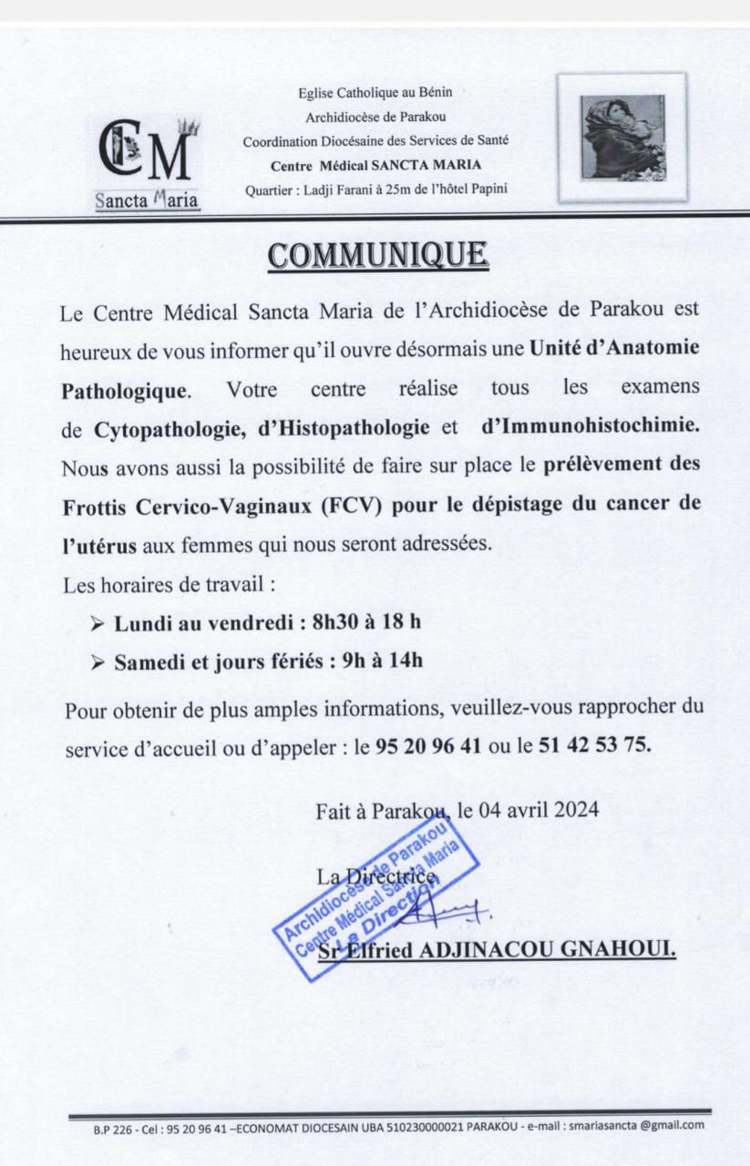"Le Centre Médical Sancta Maria de l'Archidiocèse de Parakou est heureux de vous informer qu'il ouvre désormais une Unité d'Anatomie Pathologique. "
